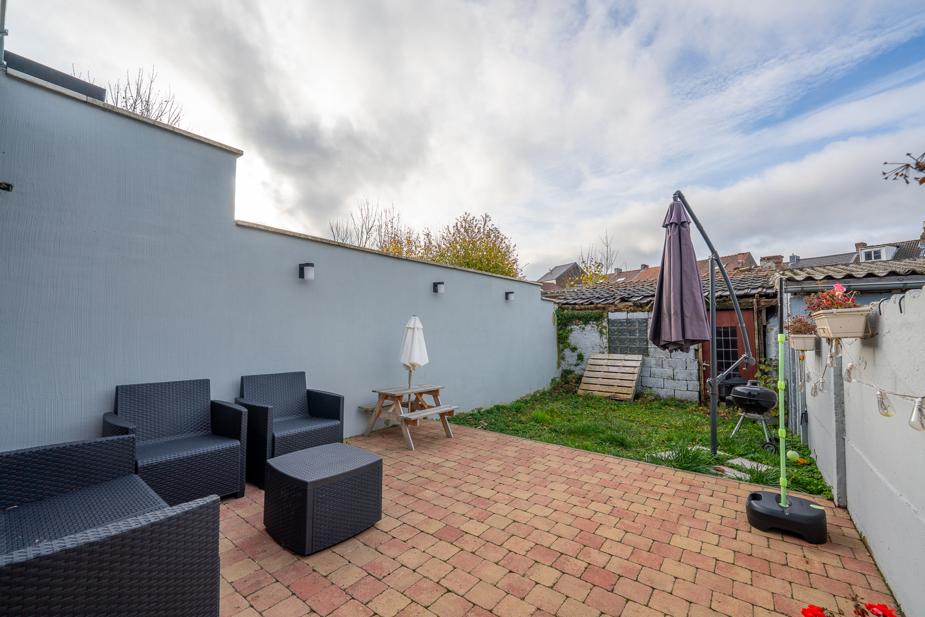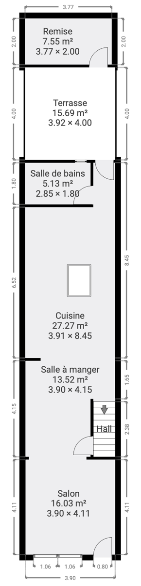 Le bien se compose, au rez-de-chaussée : d’un salon confortable, d’une salle à manger lumineuse (puits de lumière), d’une toute nouvelle cuisine super équipée avec îlot central, d’une salle de bain avec douche et toilette, d’un accès à la terrasse, d’un petit jardin et d’une remise pouvant servir de stockage.