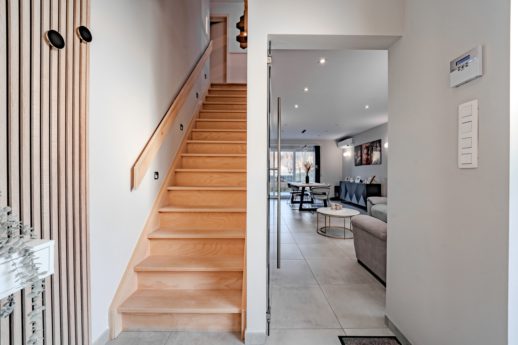 Au rez-de-chaussée, vous trouverez un hall d’entrée acceuillant avec toilette séparée, un séjour lumineux grâce à deux grandes baies vitrées, une cuisine ouverte entièrement équipée et un accès direct à la terrasse et jardin bien orienté. Un grand garage complète ce niveau, avec espace prévu pour machine à laver et séchoir.
