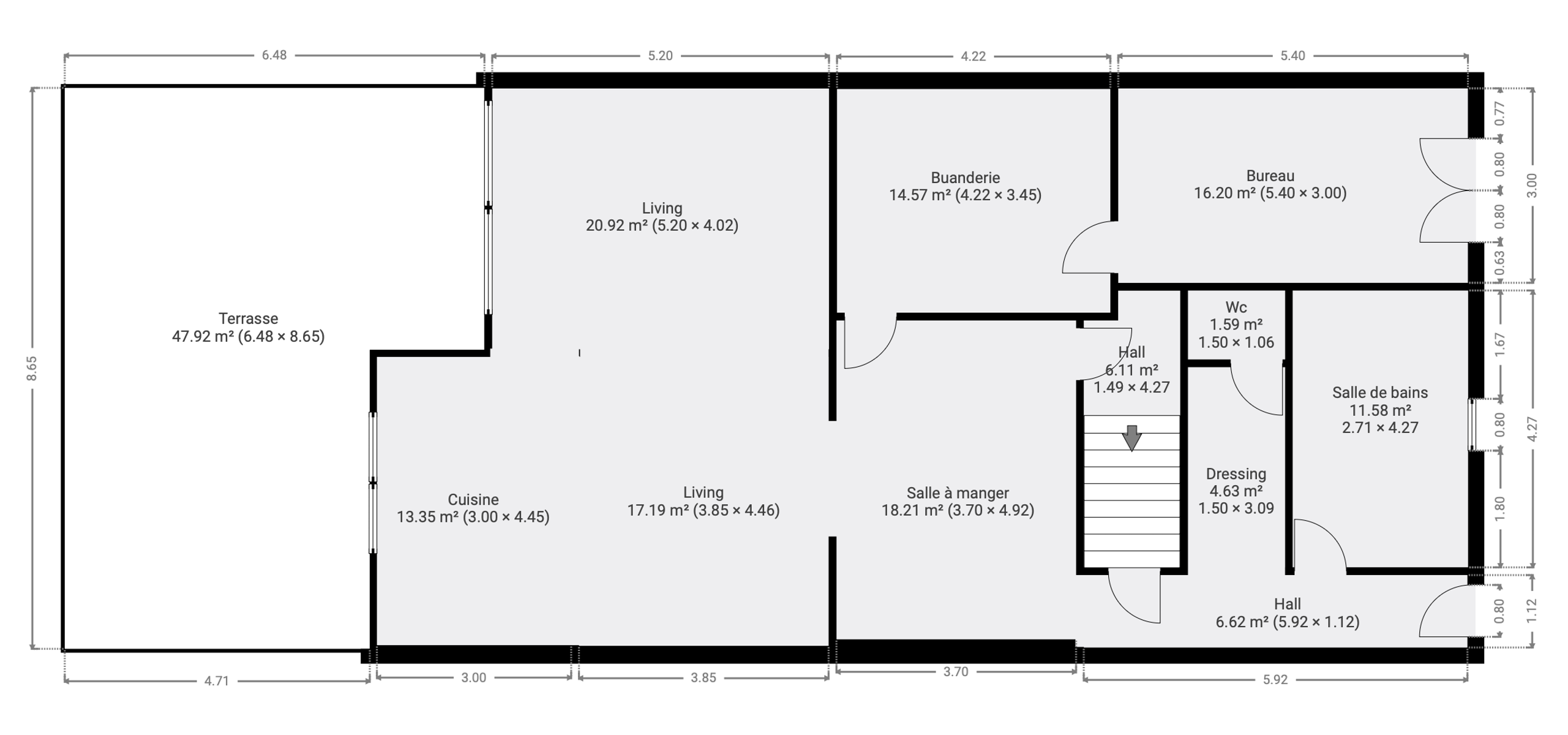 Au rez-de-chaussée : un hall d’entrée, une salle de bain, un petit vestiaire avec accès au WC, une grande pièce de vie ouverte comprenant une salle a manger, un living et une cuisine. Une baie vitrée communiquant avec la terrasse et un jardin spacieux.